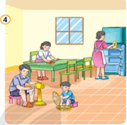Các thành viên trong gia đình đang lau tủ lạnh, bàn ghế, quạt để chúng được sạch sẽ và sử dụng tốt hơn, lâu bền hơn.