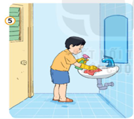 Bạn nhỏ đang lau chùi bồn rửa mặt ở trong nhà tắm. Như vậy sẽ giúp bồn rửa mặt được sạch sẽ, tránh vi khuẩn.