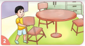 Bạn nam đang thu xếp ghế gọn gàng. Việc làm này giúp bàn ghế được gọn gàng, ngăn nắp, tạo không gian rộng rãi, tránh việc va chạm với ghế.