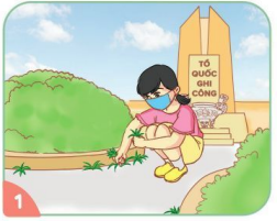 Bạn nhỏ đang chăm sóc cho nghĩa trang các anh hùng liệt sĩ, dọn dẹp cỏ, giữ cho quang cảnh được sạch đẹp.