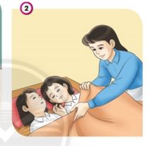 Cô giáo kéo chăn cho các bạn đang ngủ.