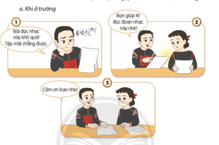 Bạn nam không biết đọc nhạc, liền tìm sự giúp đỡ của bạn nữ cùng bàn.