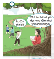 Bạn nữ đang ngồi đọc sách ở gốc đa. Một bạn rủ ra chơi cùng nhưng bạn nữ muốn tranh thủ thời gian luyện đọc rồi mới ra chơi với bạn.