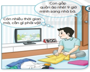 Bạn nam ngồi vừa ngồi gấp quần áo vừa xem ti vi. Do không tập trung làm việc nên đã đến giờ sang thăm bà mà bạn vẫn chưa gấp xong quần áo.