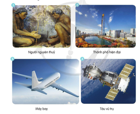 a, Những điều em quan sát được ở mỗi hình ảnh là: con người thời nguyên thủy, nhà cửa, thành phố hiện đại, máy bay và tàu vũ trụ.