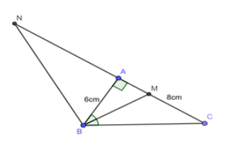 Cho tam giác \(ABC\) vuông tại \(A\) có cạnh \(AB = 6cm\) và \(AC = 8cm\) . Các phân giác trong và ngoài của góc \(B\) cắt đường thẳng \(AC\) lần lượt tại \(M\) và \(N\). Tính các đoạn thẳng \(AM\) và \(AN\).