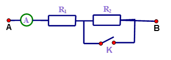 – Khi khóa K đóng thì dòng điện không đi qua điện trở \({R_2}\), nên số chỉ của ampe kế là số chỉ cường độ dòng điện chạy trong mạch