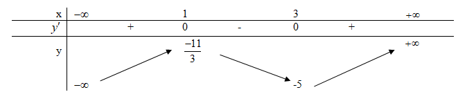 \(\begin{array}{l}y = \dfrac{{{x^3}}}{3} – 2{x^2} + 3x – 5\\y’ = {x^2} – 4x + 3\\y’ = 0 \Leftrightarrow {x^2} – 4x + 3 = 0\\ \Leftrightarrow \left[ \begin{array}{l}x = 3\\x = 1\end{array} \right.\end{array}\)