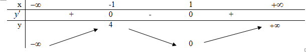 \(\begin{array}{l}y’ =  – 3{x^2} + 3\\y’ = 0 \Leftrightarrow  – 3{x^2} + 3 = 0\\ \Leftrightarrow \left[ \begin{array}{l}x = 1\\x =  – 1\end{array} \right.\end{array}\)