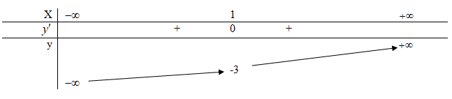 \(\begin{array}{l}y’ = 3{x^2} – 6x + 3\\y’ = 0 \Leftrightarrow 3{x^2} – 6x + 3 = 0\\ \Leftrightarrow x = 1\end{array}\)