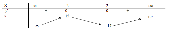 \(\begin{array}{l}y’ = 3{x^2} – 12\\y’ = 0 \Leftrightarrow 3{x^2} – 12 = 0\\ \Leftrightarrow {x^2} – 4 = 0 \Leftrightarrow \left[ \begin{array}{l}x = 2\\x =  – 2\end{array} \right.\end{array}\)