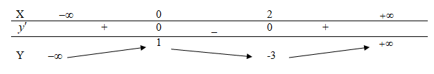\(\begin{array}{l}y’ = 3{x^2} – 6x\\y’ = 0 \Leftrightarrow 3{x^2} – 6x = 0\\ \Leftrightarrow \left[ \begin{array}{l}x = 0\\x = 2\end{array} \right.\end{array}\)