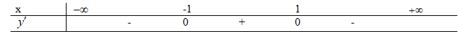 \(\begin{array}{l}y’ =  – 3{x^2} + 3\\y’ = 0 \Leftrightarrow  – 3{x^2} + 3 = 0\\ \Leftrightarrow \left[ \begin{array}{l}x = 1\\x =  – 1\end{array} \right.\end{array}\)