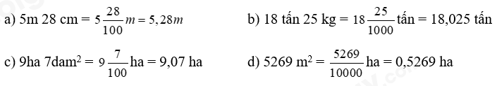 a) 5m 28 cm = ……..m                                b) 18 tấn 25 kg = ……. tấn