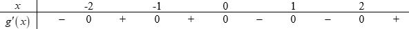 Cho \(g’\left( x \right) = 0 \Leftrightarrow \left[ {\begin{array}{*{20}{l}}{x = 0}\\{{x^2} – 2 =  – 1}\\{{x^2} – 2 = 2}\end{array}} \right. \Leftrightarrow \left[ {\begin{array}{*{20}{l}}{x = 0}\\{x = {\rm{\;}} \pm 1}\\{x = {\rm{\;}} \pm 2}\end{array}} \right.\), trong đó \(x = {\rm{\;}} \pm 1\) là nghiệm bội 2.