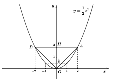 2) Trên đồ thị hàm số \(y = \frac{1}{2}{x^2}\) lấy điểm \(A\) có hoành độ bằng \(2\) và điểm \(B\) có tung độ bằng \(2\) (điểm \(B\) khác điểm \(A\)). Hãy viết phương trình đường thẳng \(AB\) và chứng minh \(\Delta OAB\) cân.