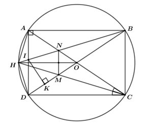 2) Dây \(HC\) của \(\left( O \right)\) cắt \(BD\) tại \(M\), dây \(HB\) của \(\left( O \right)\) cắt \(AC\) tại \(N\). Chứng minh: Tứ giác\(MNBC\) nội tiếp và \(MN \bot OH\).