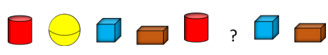 Ta thấy, các hình được sắp xếp theo thứ tự: hình trụ, hình cầu, hình lập phương, hình hộp chữ nhật rồi tiếp tục lặp lại như vậy.