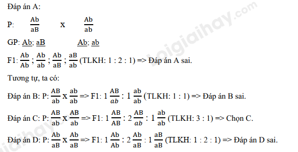Câu 6. Cho biết mỗi gen quy định một tính trạng, alen trội là trội hoàn toàn, các gen liên kết hoàn toàn. Theo lý thuyết, phép lai nào sau đây cho đời con có kiểu hình phân li theo tỉ lệ 3:1?