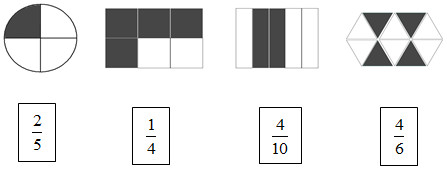 – Phân số chỉ số phần tô màu của mỗi hình có tử số là số ô được tô màu và mẫu số là tổng số ô của hình đó.