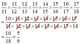 \(\dfrac{{10}}{{11}} \times \dfrac{{11}}{{12}} \times \dfrac{{12}}{{13}} \times \dfrac{{13}}{{14}} \times \dfrac{{14}}{{15}} \times \dfrac{{15}}{{16}} \)\(\times \dfrac{{16}}{{17}} \times \dfrac{{17}}{{18}}\)