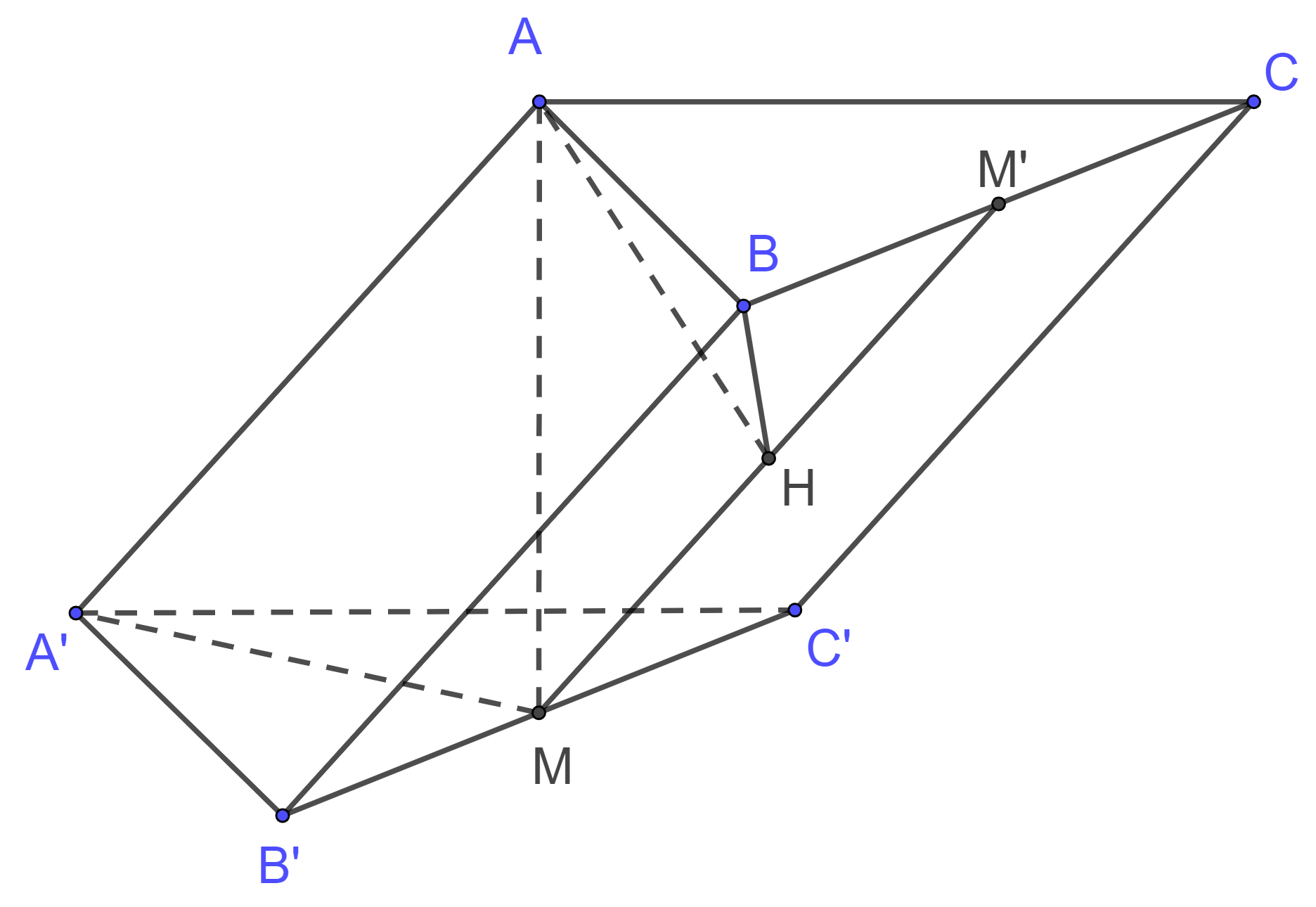 Ta có: \(\begin{array}{l}\left\{ {\begin{array}{*{20}{c}}{BC \bot \,\,AM}\\{BC \bot \,AH}\end{array}\,\, \Rightarrow BC \bot (AA’MM’)} \right.\\ \Rightarrow BC \bot A’M;\,\,BC\,\, \bot MM’\end{array}\)