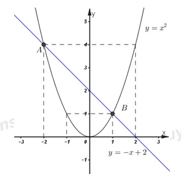 Vậy hai đồ thị cắt nhau tại hai điểm phân biệt \(A\left( { – 2;\;4} \right)\) và \(B\left( {1;\;1} \right).\)