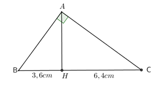 Ta có: \(\left( {H \in BC} \right)\) nên : \(BC = BH + HC = 3,6 + 6,4 = 10\left( {cm} \right)\)