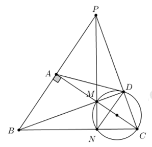 Cho tam giác ABC vuông tại A \(\left( {AB < AC} \right)\), M là trung điểm của cạnh AC. Đường tròn đường kính  MC cắt BC tại N. Đường thẳng BM cắt đường tròn đường kính MC tại D.