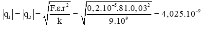 Hai điện tích điểm bằng nhau được đặt trong nước ( ε = 81) cách nhau 3cm. Lực đẩy giữa chúng bằng 0,2.10-15 N. Hai điện tích đó là