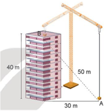 Một chiếc cần cẩu xây dựng cẩu một khối vật liệu nặng 500 kg từ vị trí A ở mặt đất đến vị trí B của một tòa nhà cao tầng với các thông số cho trên Hình 25.6. Lấy gia tốc trọng trường g = 9,8 m/s. Tính công mà cần cẩu đã thực hiện (kJ)
