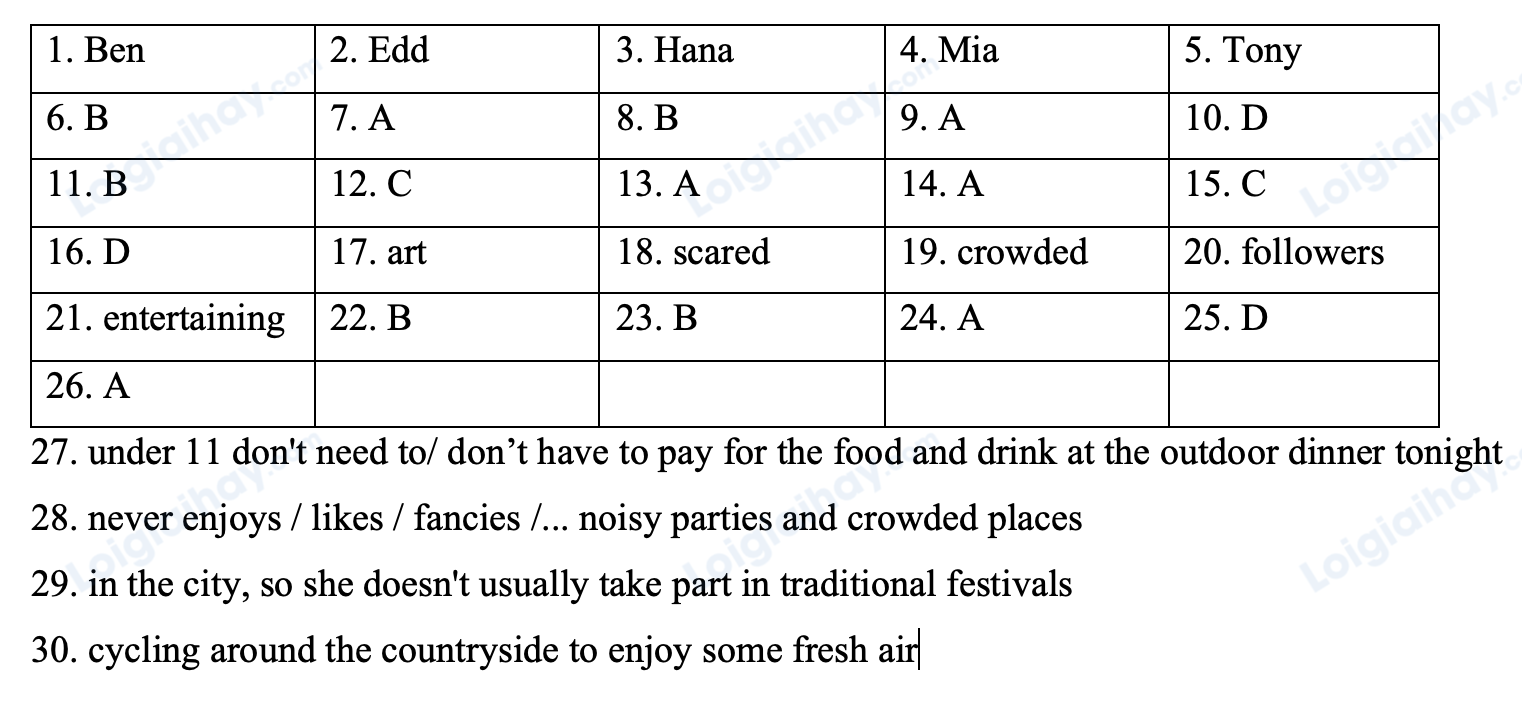 Đáp án: never enjoys / likes / fancies/… noisy parties and crowded places.