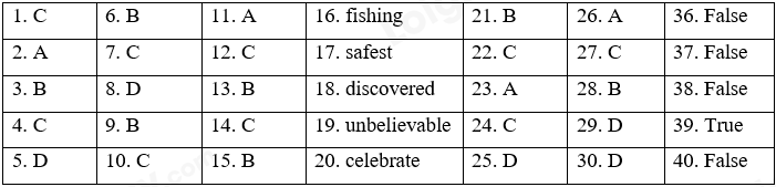 I. Choose the word that has different sound in the underlined part. II. Choose the word with a different stress pattern. III. Choose the best answer. IV. Write the correct form of the word given. V. Read the passage and choose the best option to answer each of the following questions. VI. Read the passage and choose the best answer to fill in each blank. VII. Complete the second sentences without changing the meaning from the first, using the words given in the brackets. VIII. Listen and decide