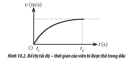 Một vật chuyển động trong không khí, trong nước hoặc trong chất lỏng nói chung đều sẽ chịu tác dụng của lực cản. Xét một viên bi thép có khối lượng 1 g đang ở trạng thái nghỉ được thả rơi trong dầu. Người ta khảo sát chuyển động của viên bi trong dầu và vẽ đồ thị tốc độ theo thời gian của viên bi như Hình 10.2. Cho biết lực đẩy Archimecdes có độ lớn là FA=1,2.10−3 N và lấy g = 9,8 m/s2. Độ lớn lực cản của dầu tác dụng lên viên bi sau thời điểm t2 là bao nhiêu?