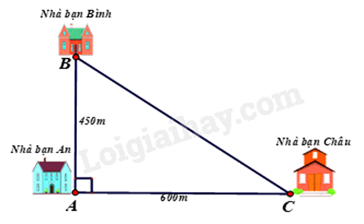1. Nhà bạn An (vị trí A trên hình vẽ) cách nhà bạn Châu (vị trí C trên hình vẽ) 600m và cách nhà bạn Bình (vị trí B trên hình vẽ) 450m. Biết rằng 3 vị trí: nhà An, nhà Bình và nhà Châu là 3 đỉnh của một tam giác vuông (xem hình vẽ). Hãy tính khoảng cách từ nhà Bình đến nhà Châu.