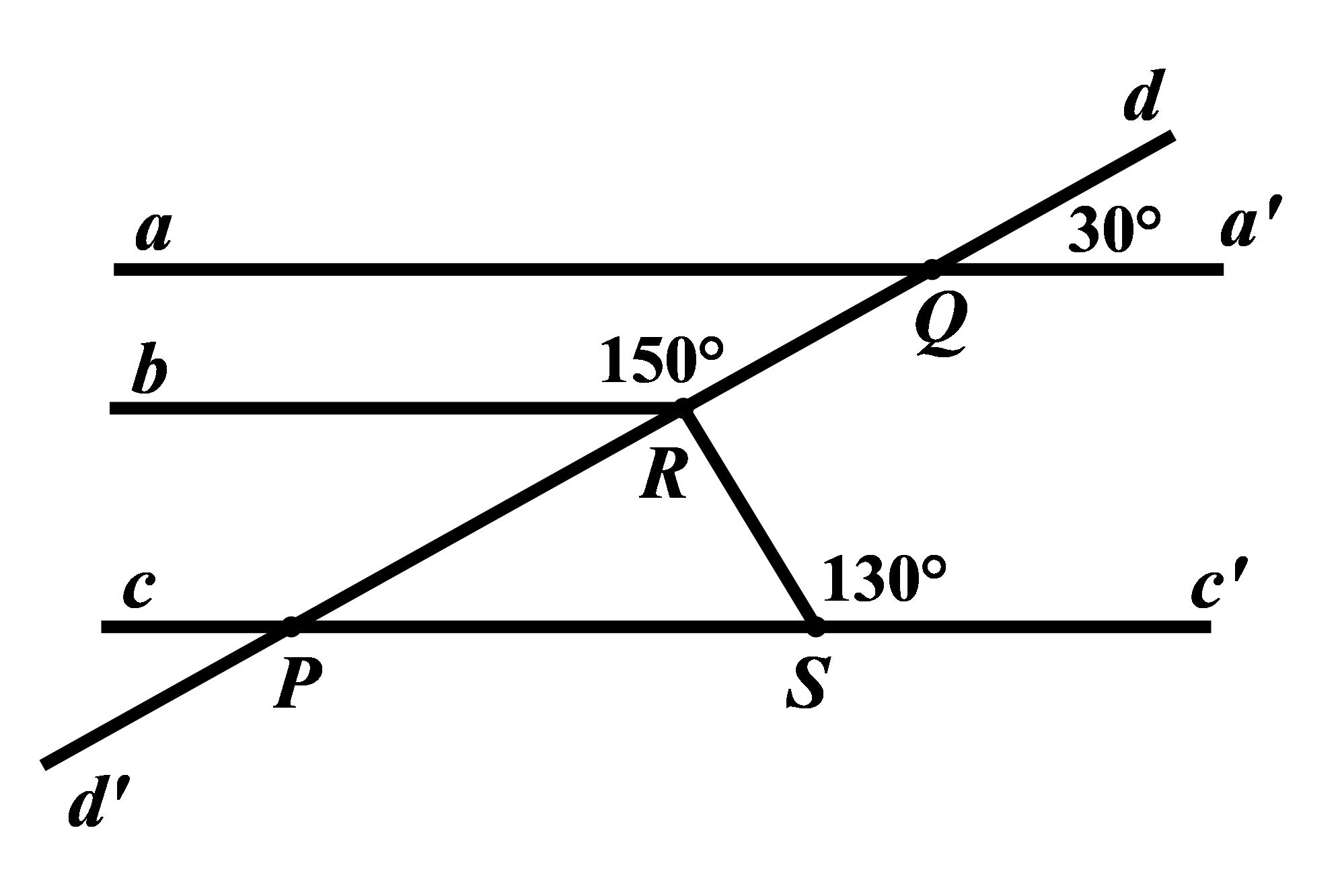 Do \(aa’//cc’\) nên \(\angle dPc’ = \angle dQa’ = {30^0}\) (hai góc đồng vị). Vì vậy \(\angle dPc’ = \angle QRb’\) (cùng bằng \({30^0}\)).