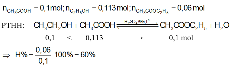 Điều chế ethyl acetate bằng cách cho 6 gam acetic acid tác dụng với 5,2 gam ethanol có xúc tác là dung dịch sulfuric acid đặc và đun nóng, thu được 5,28 gam ester. Tính hiệu suất của phản ứng.