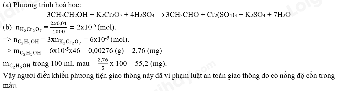 (b) Khi chuẩn độ 5 mL mẫu huyết tương máu của một người lái xe cần dung 2 mL dung dịch K2Cr2O7  0,01M. Vậy người này có vi phạm luật khi tham gia điều khiển phương tiện giao thông hay không? Tại sao? Giả sử rằng trong thí nghiệm trên chỉ có ethanol tác dụng với K2Cr2O7.