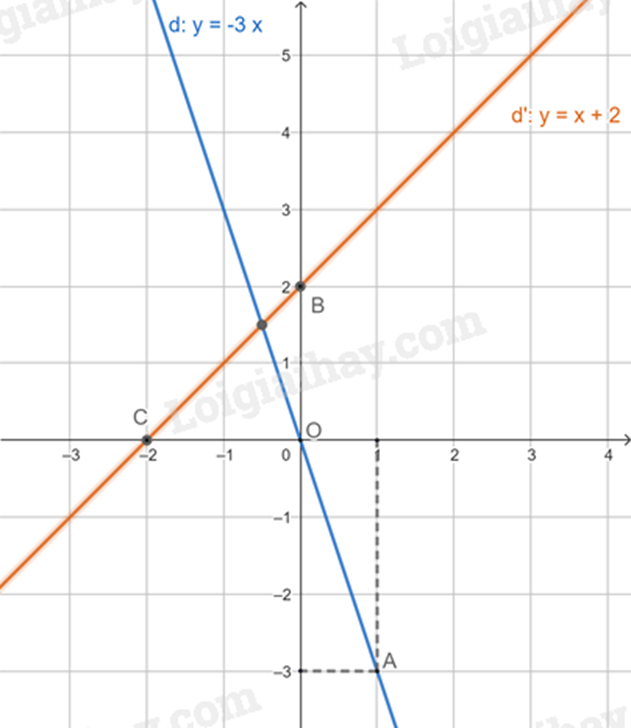 Cho đường thẳng \(\left( d \right):y =  – 3x\) và đường thẳng \(\left( {d’} \right):y = x + 2\).
