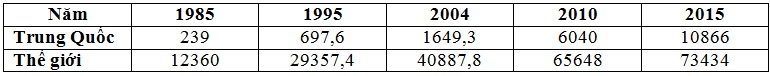 => Biểu đồ thích hợp nhất để thể hiện tỉ trọng GDP của Trung Quốc so với thế giới giai đoạn 1985 – 2015 (5 năm) là biểu đồ miền.