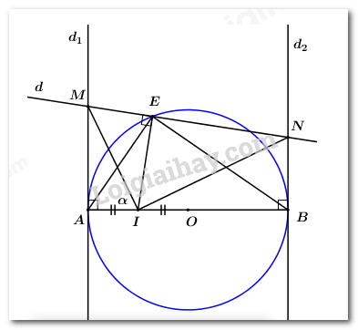 Cho đường tròn tâm \(O\) đường kính \(AB = 2R\). Gọi \(I\) là trung điểm của đoạn thẳng \(OA\), \(E\) là điểm thay đổi trên đường tròn \(\left( O \right)\) sao cho \(E\) không trùng với \(A\) và \(B\). Dựng đường thẳng \({d_1}\) và \({d_2}\) lần lượt là các tiếp tuyến của đường tròn \(\left( O \right)\) tại \(A\) và \(B\). Gọi \(d\) là đường thẳng qua \(E\) và vuông góc với \(EI\). Đường thẳng \(d\) cắt \({d_1}\), \({d_2}\) lần lượt tại \(M,\,\,N\).