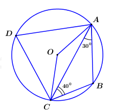 Cho tứ giác \(ABCD\) nội tiếp đường tròn \(\left( O \right)\), biết \(\angle BAC = {30^0}\), \(\angle BCA = {40^0}\) (như hình vẽ bên). Tính số đo các góc \(\angle ABC,\,\,\angle ADC\) và \(\angle AOC\).