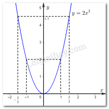 \( \Rightarrow \) Parabol \(y = 2{x^2}\) là đường cong đi qua các điểm \(\left( { – \frac{3}{2};\frac{9}{2}} \right);\,\,\left( { – 1;2} \right);\,\,\left( {0;0} \right);\,\,\left( {1;2} \right);\,\,\left( {\frac{3}{2};\frac{9}{2}} \right)\).