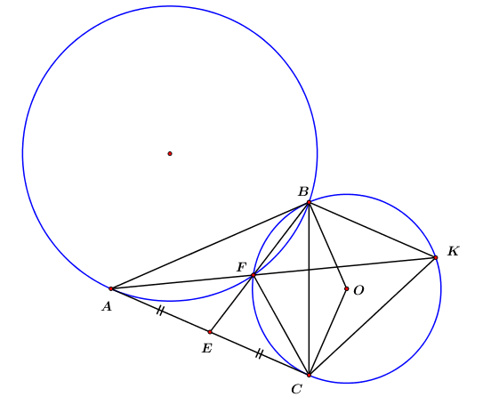 1. Qua điểm \(A\) nằm ngoài đường tròn \(\left( O \right)\) vẽ hai tiếp tuyến \(AB\)\(AC\) của đường tròn (\(B\)\(C\) là các tiếp điểm). Gọi \(E\) là trung điểm của của đoạn thẳng \(AC\), \(F\) là giao điểm thứ hai của đường thẳng \(EB\) với đường tròn \(\left( O \right)\), \(K\) là giao điểm của đoạn thẳng \(AC\), \(F\) là giao điểm thứ hai của đường thẳng \(AF\) với đường tròn \(\left( O \right)\). Chứng minh: