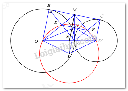 b) Gọi \(E\) là giao điểm của \(AB\) với \(OM\) và \(F\) là giao điểm của \(AC\) với \(O’M\). Chứng minh tứ giác \(OEFO’\) nội tiếp một đường tròn.