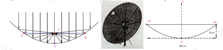 Các ăng ten parabol thu sóng hoạt động dựa theo nguyên lý: mọi tia sóng song song với trục của parabol đều có tia phản xạ đi qua tiêu điểm \(F\) của parabol (vì vậy nếu ta đặt thiết bị thu sóng tại \(F\) thì sẽ thu sóng được tốt nhất). Người ta chứng minh được rằng: Nếu đường thẳng vuông góc với trục của parabol tại \(F\) cắt parabol tại 2 điểm \(A,B\) thì \(OF = \dfrac{1}{4}AB\) với \(O\) là đỉnh của parabol (tham khảo hình vẽ).