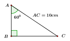 Câu 6. Cho \(\Delta ABC\) vuông tại \(B\) biết \(AC = 10cm,\) \(\angle A = {60^0}.\) Độ dài đoạn \(AB\) là: