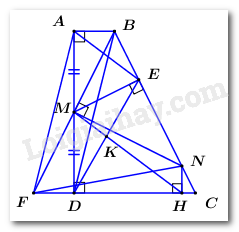 Vậy \(\Delta BNF\) cân tại \(N\) (tam giác có trung tuyến đồng thời là đường cao).d) Gọi \(MH \cap DE = \left\{ K \right\}\).