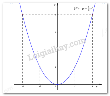 Vậy đồ thị hàm số \(\left( P \right):\,\,y = \dfrac{1}{2}{x^2}\) là đường cong nhận trục tung làm trục đối xứng và đi qua các điểm \(\left( { – 4;\,\,8} \right),\,\,\left( { – 2;\,\,2} \right),\,\,\left( {0;\,\,0} \right),\,\,\,\left( {2;\,\,2} \right),\,\,\,\left( {4;\,\,8} \right).\)