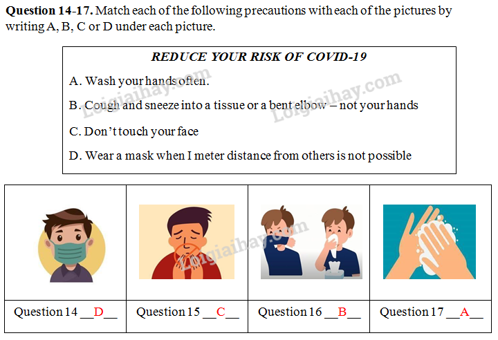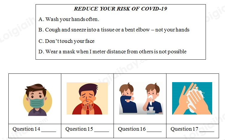 Question 14-17. Match each of the following precautions with each of the pictures by writing A, B, C or D under each picture. (Nối mỗi lời khuyên sau với từng bức tranh bằng cách viết A, B, C hoặc D dưới mỗi bức tranh.)
